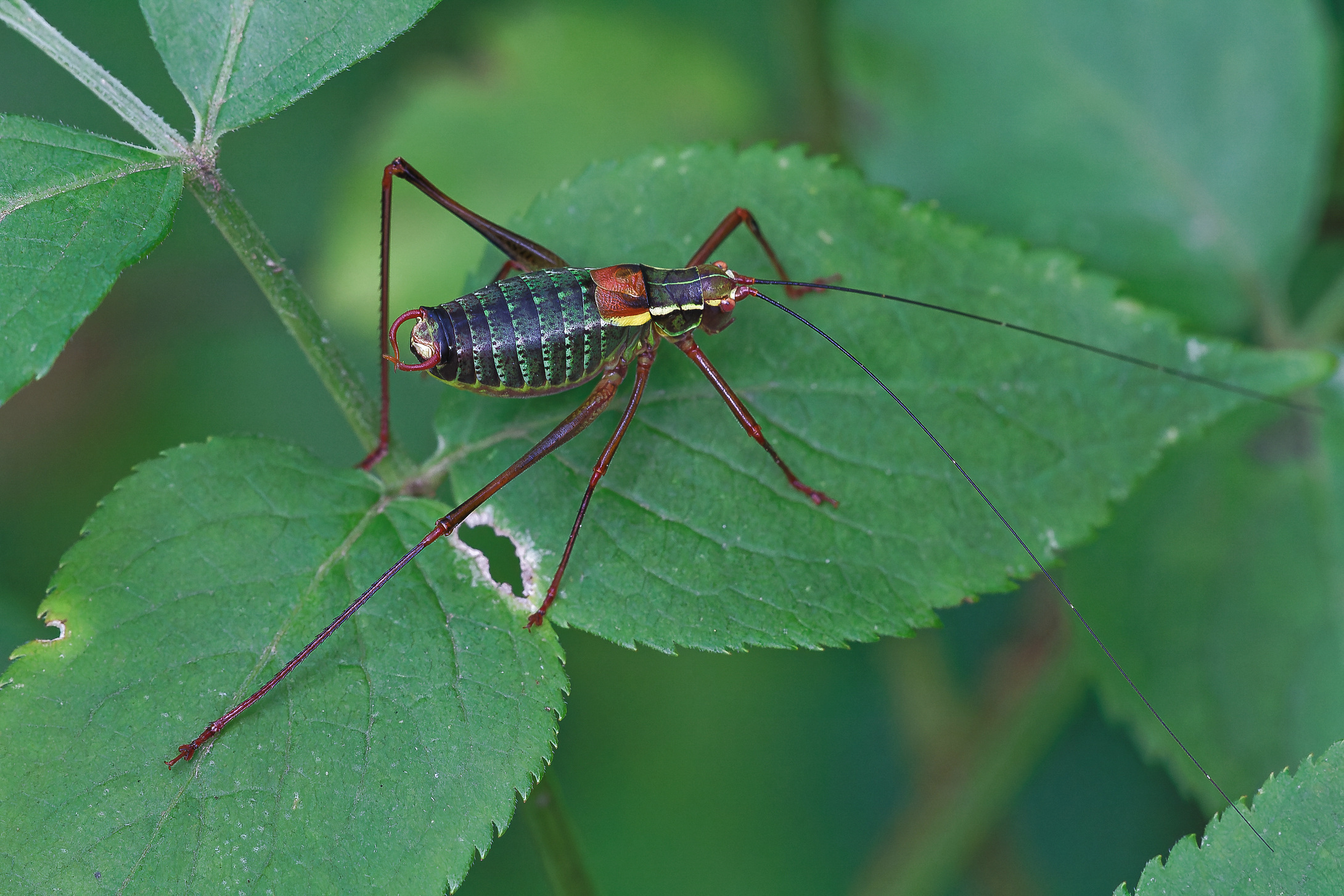 Die Larven mancher Laubschrecken sehen echt hübsch aus , als ich diese Larve einer Laubheuschrecke fand , war ich auch erstaunt , sie war sehr winzig . Die R7 hatte ich gerade drei Monate in der Makrofotografie am Üben . Einen Blitz und Diffusor hatte ich zu dem Zeitpunkt auch noch nicht .